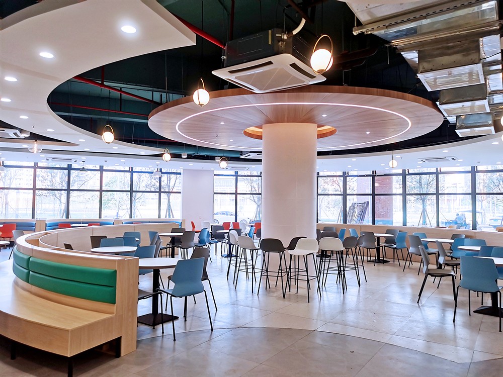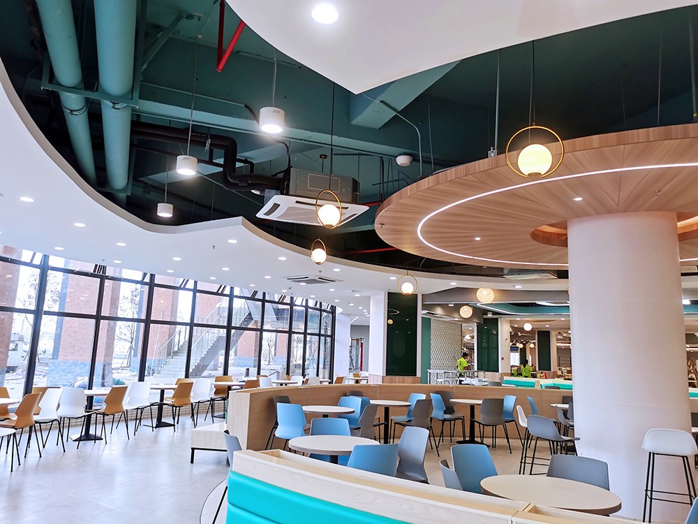 設計理念:空間設計力在突破傳統(tǒng)食堂形式,表達校園食堂快樂食間品牌意識,傳遞快樂食間價值觀。為學生和老師提供有品位的就餐環(huán)境,享受美食之外還具有學習、聚會、獨處的空間功能。整體空間在以白色為主基調的設計中,將天花裝飾藍色,柱子選用了一點墨綠色進行點綴,以注入環(huán)保、科技、自然等元素,呈現出美感與實用兼?zhèn)涞膭?chuàng)新設計。木質桌椅溫潤自然,大盆綠植規(guī)律擺放,搭配錯落有致,整個空間自然開闊。