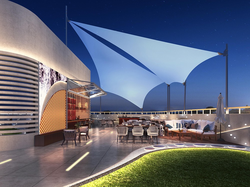 設計理念:室外開闊的明堂,水流猶如天上之水祥降而下,營造來水環(huán)繞的景觀。圍欄上跳動的線條,與天上的星空相接點點的繁星,流光似水。帶有韻味的用餐環(huán)境,以山作為背景,加上水波紋作天花,這樣可以營造一個山環(huán)水抱的祥和景象,寓意著四海朋友匯聚的地方。