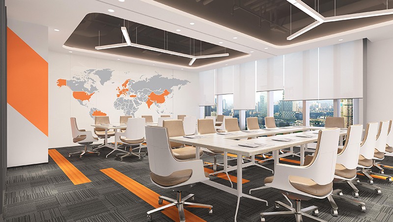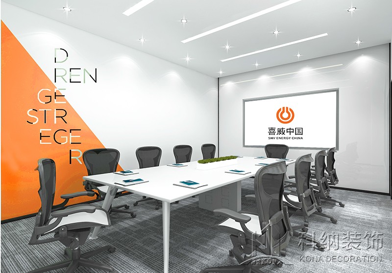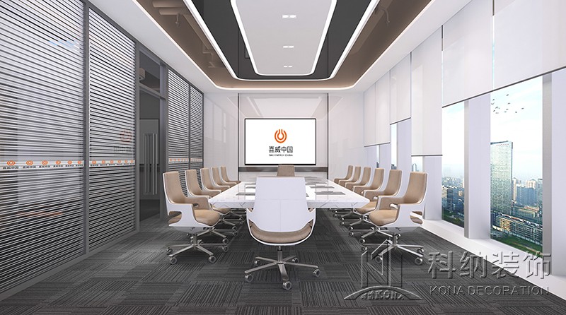 中會議室墻面配以灰色乳膠漆,簡單的圖案豐富空間的層次感,使整個辦公空間色調(diào)干凈高雅;白色軟膜天花相結(jié)合的造型吊頂,形成快捷明亮舒適的室內(nèi)空間,這也是辦公室設(shè)計的功能要求所決定的。