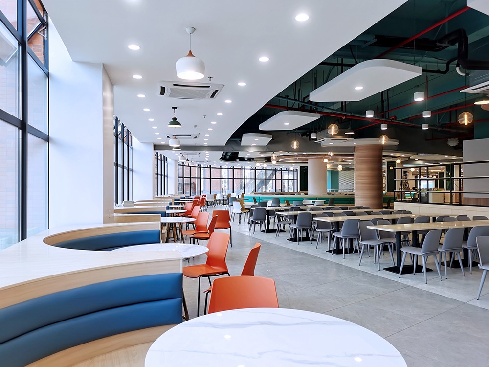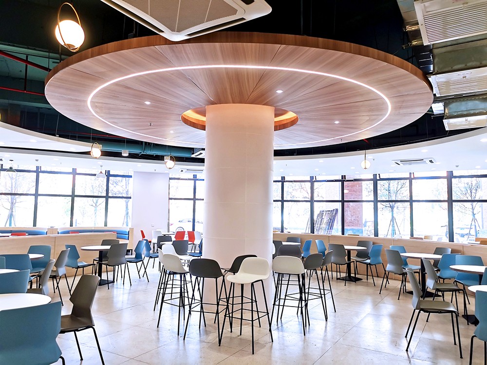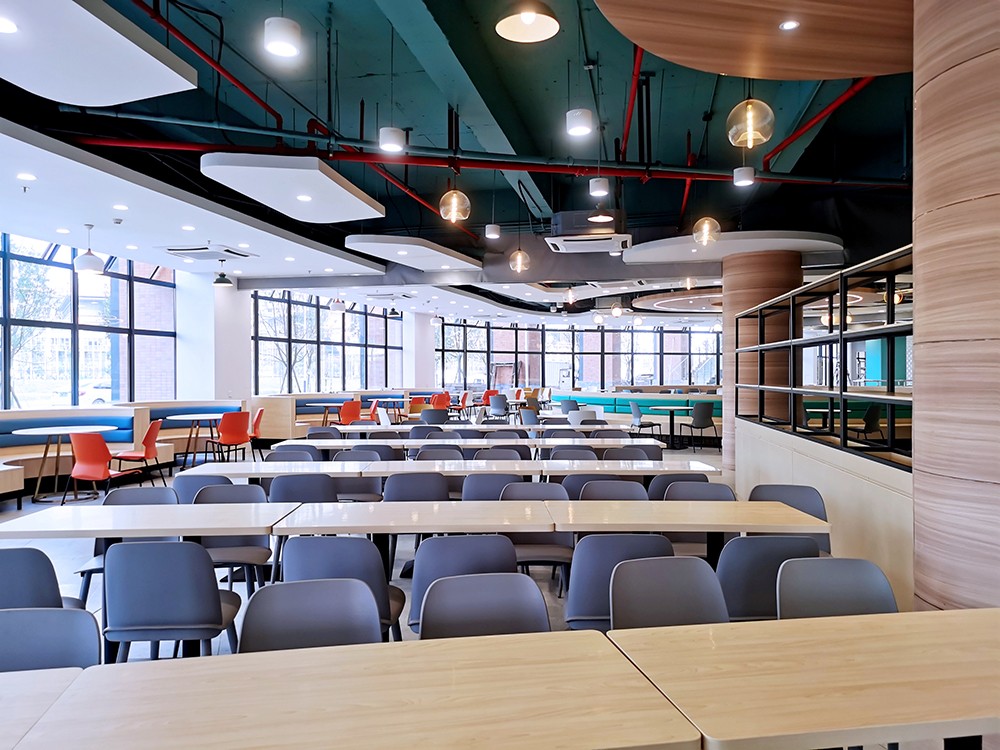 設(shè)計理念:空間設(shè)計力在突破傳統(tǒng)食堂形式,表達(dá)校園食堂快樂食間品牌意識,傳遞快樂食間價值觀。為學(xué)生和老師提供有品位的就餐環(huán)境,享受美食之外還具有學(xué)習(xí)、聚會、獨(dú)處的空間功能。整體空間在以白色為主基調(diào)的設(shè)計中,將天花裝飾藍(lán)色,柱子選用了一點(diǎn)墨綠色進(jìn)行點(diǎn)綴,以注入環(huán)保、科技、自然等元素,呈現(xiàn)出美感與實(shí)用兼?zhèn)涞膭?chuàng)新設(shè)計。木質(zhì)桌椅溫潤自然,大盆綠植規(guī)律擺放,搭配錯落有致,整個空間自然開闊。