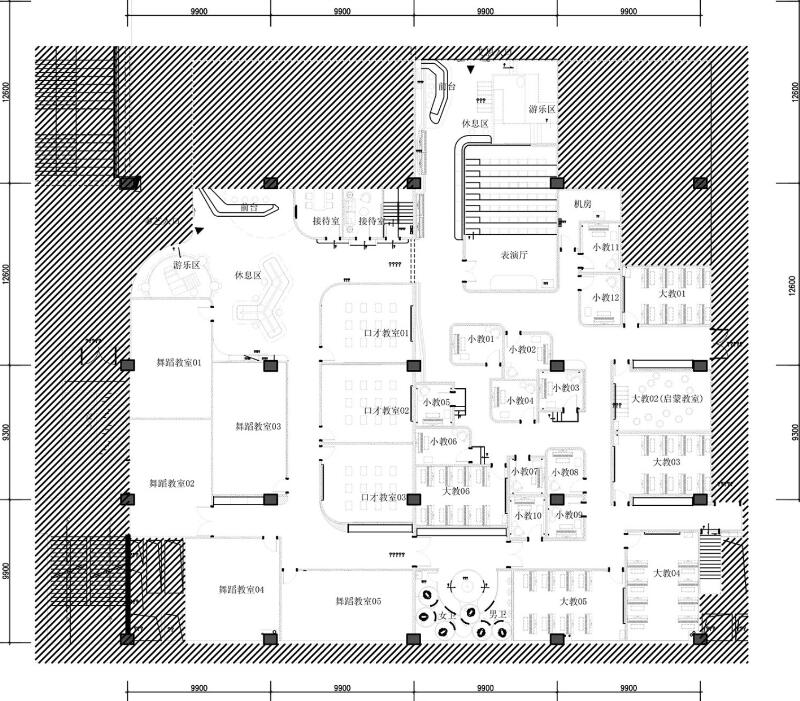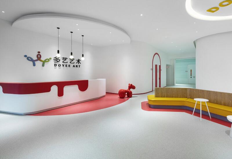 設(shè)計(jì)理念:根據(jù)教學(xué)內(nèi)容設(shè)計(jì)師規(guī)劃出口才室、舞蹈表演室以及鋼琴室等。設(shè)計(jì)師考慮兒童玩樂天性,并融合企業(yè)需求,在滿足教學(xué)空間的基礎(chǔ)上最大限度預(yù)留了公共空間,來提高孩子們的交際能力,在交流和分享中增強(qiáng)他們?nèi)烁窕呐囵B(yǎng)。