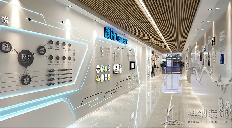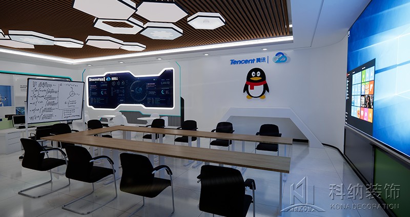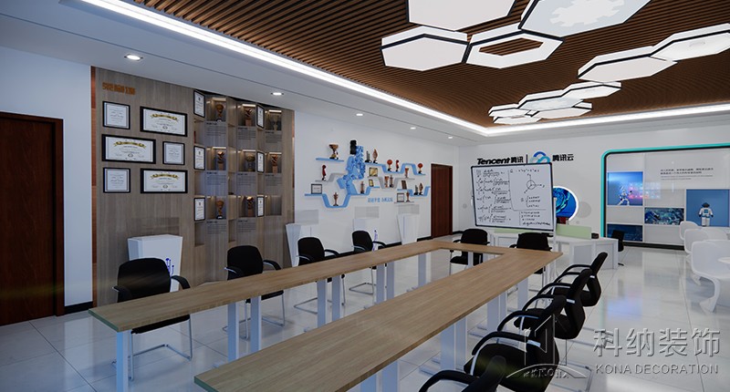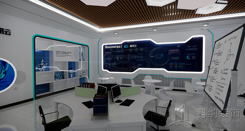 設(shè)計(jì)理念:創(chuàng)客中心是創(chuàng)客教育當(dāng)中一個(gè)重要內(nèi)容,用富有科技感和視覺(jué)沖擊力的教室場(chǎng)景,搭配創(chuàng)客活動(dòng)的教具套件設(shè)備,能夠更好的激發(fā)學(xué)生的創(chuàng)造力和學(xué)習(xí)興趣!這次是科技學(xué)院校園內(nèi)騰訊云創(chuàng)客中心設(shè)計(jì)項(xiàng)目,整體富有科技感的線條,營(yíng)造一種極致的沉浸式體驗(yàn),設(shè)計(jì)師在造型上加強(qiáng)流線型的曲面屬性使之產(chǎn)生的流動(dòng)性引導(dǎo)了整個(gè)視覺(jué)路線。走廊兩側(cè)充分利用空間尺度,采用白色墻面做背景LED條形燈模擬芯片線路,矩陣元素?zé)òl(fā)出時(shí)尚動(dòng)感的光,不同角度的直線構(gòu)成簡(jiǎn)單的空間關(guān)系,構(gòu)建簡(jiǎn)潔大氣的視覺(jué)印象,營(yíng)造出極致的空間體驗(yàn)。